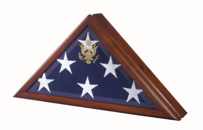 One of our most popular Flag Cases with an embossed Great Seal of the United States on elegant beveled glass. Heirloom Walnut. Same profile as the Presidential Flag Case, however this one opens from the Back wood panel with turn button closure. Hanger included to mount on wall. Made in America